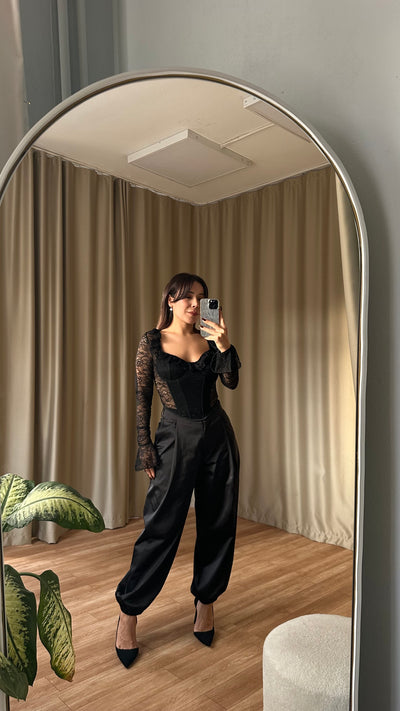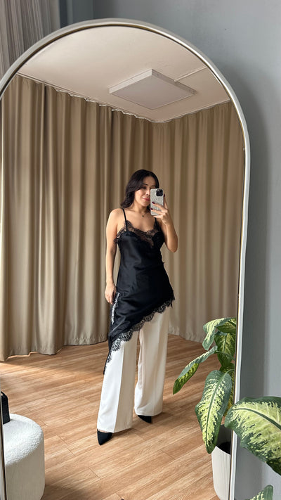 DANTEL DETAYLI Siyah SATEN SLİP ELBİSE
