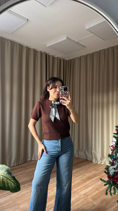 Fularlı triko kazak kahve