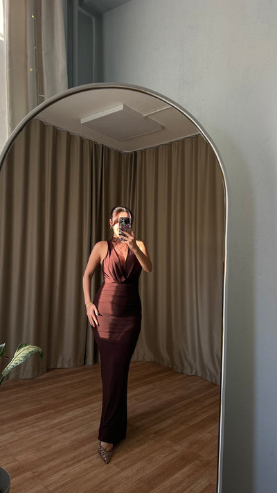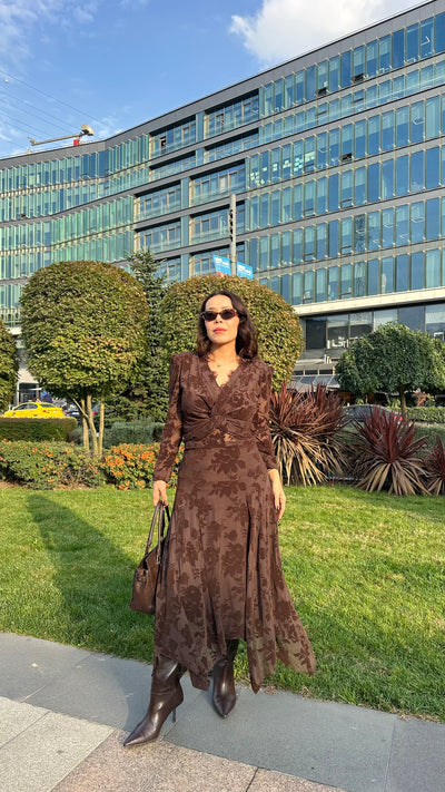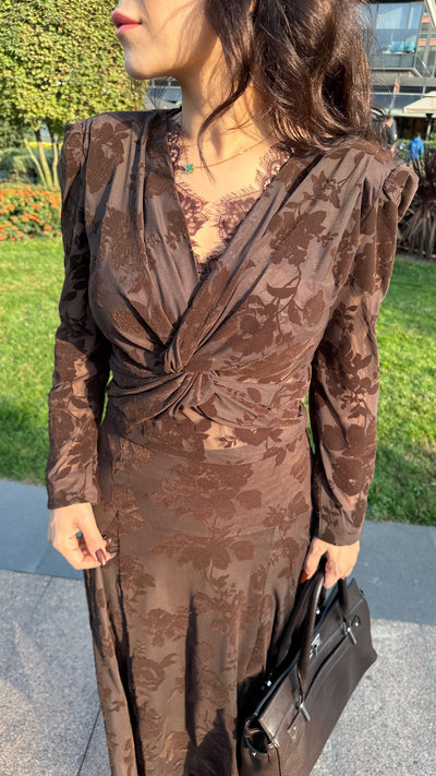 Dantel detaylı dekolteli kahve elbise