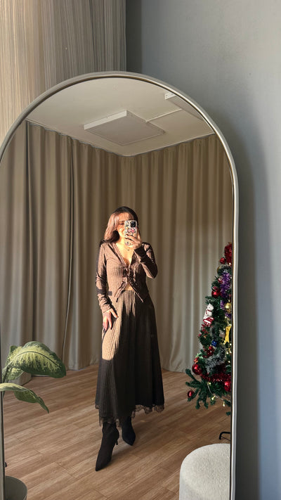 Dantel detaylı kahve elbise