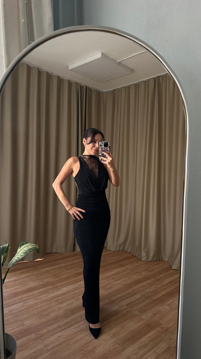 Dantal detaylı dekolteli siyah elbise