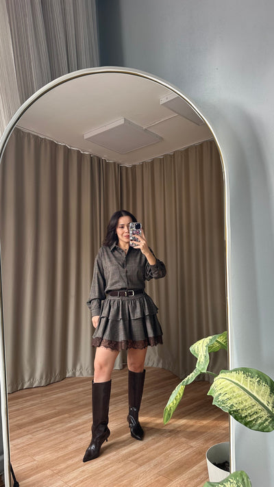 Kahve Dantel detaylı kendinden kemerli ekose takım