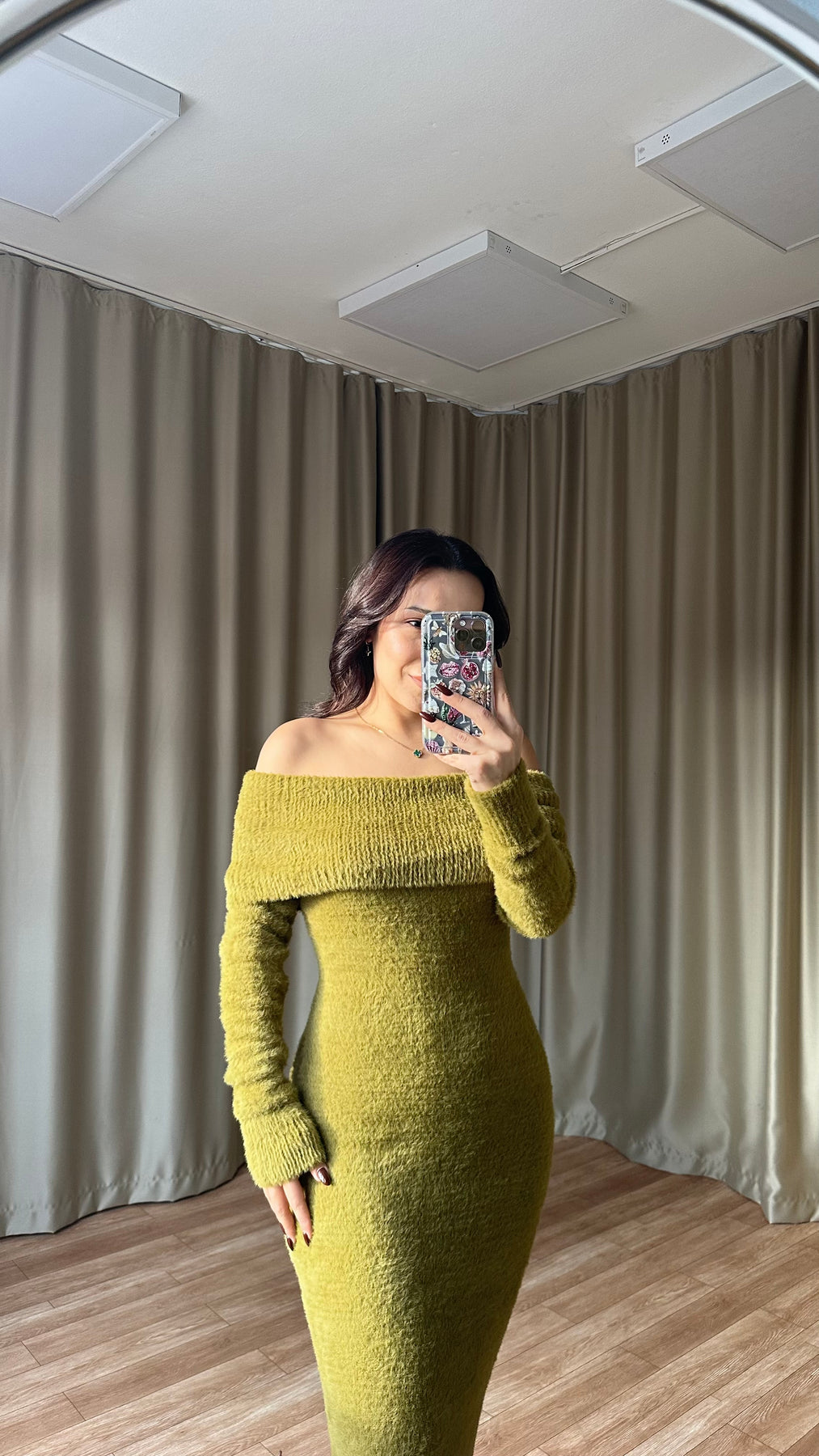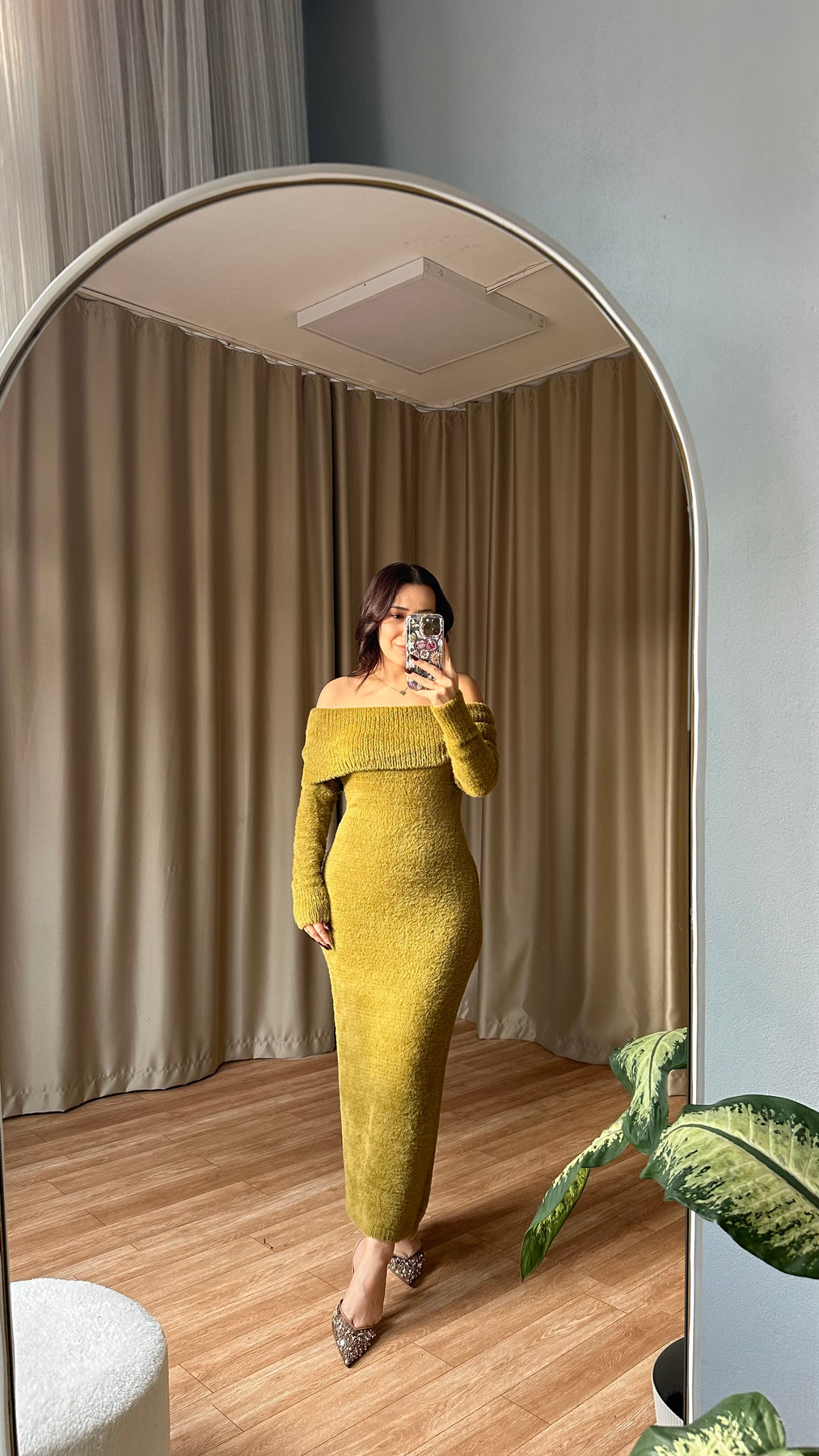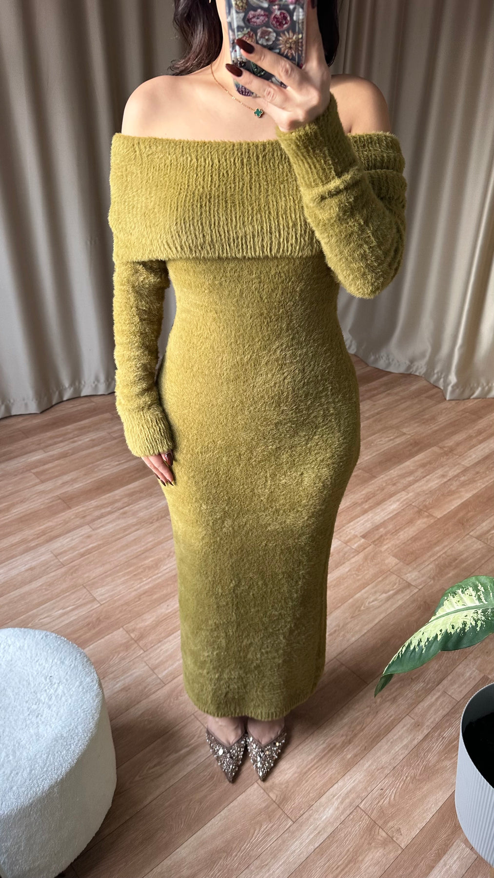 MADONNA YAKA yağ yeşili SAKALLI TRİKO ELBİSE