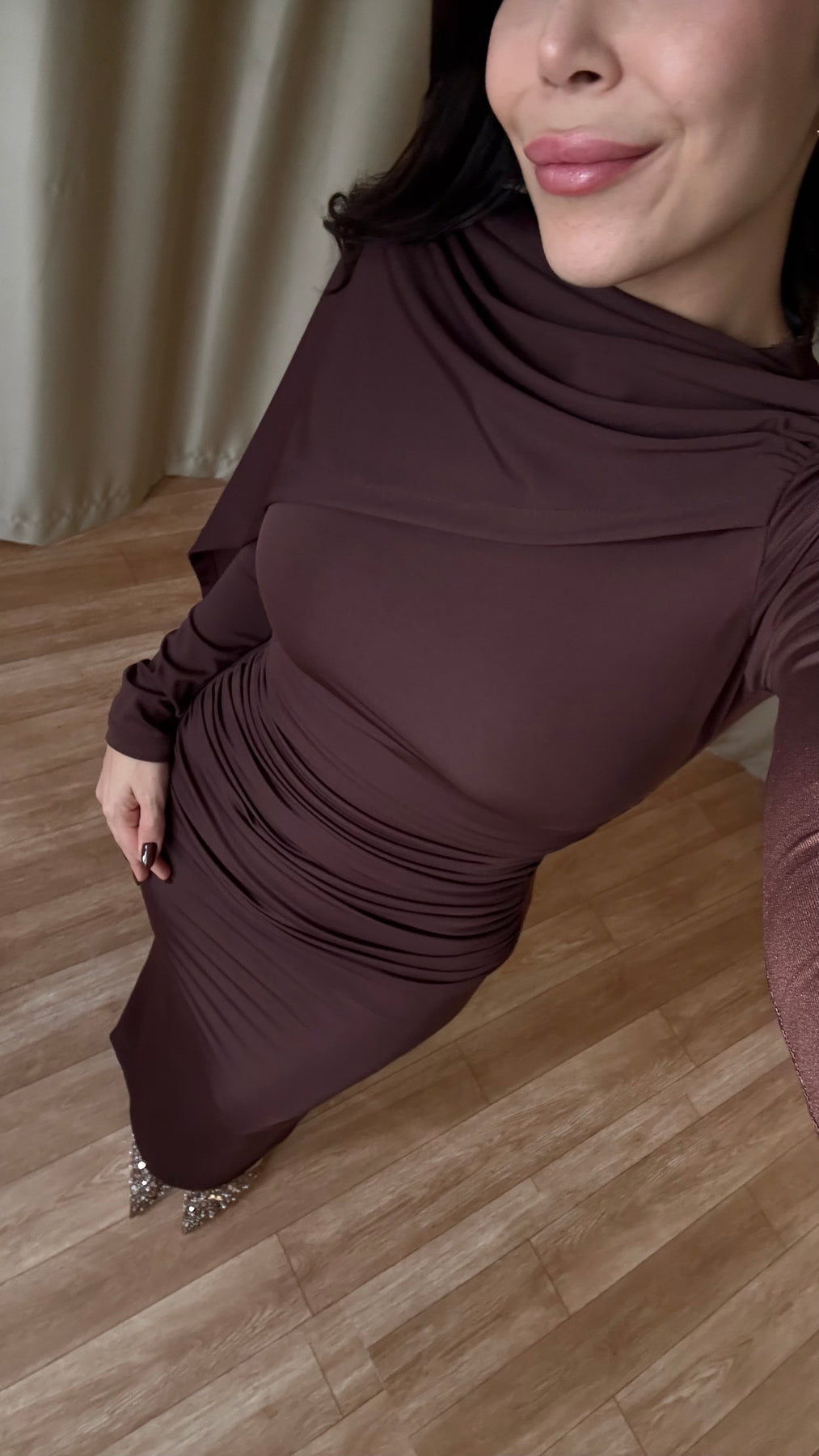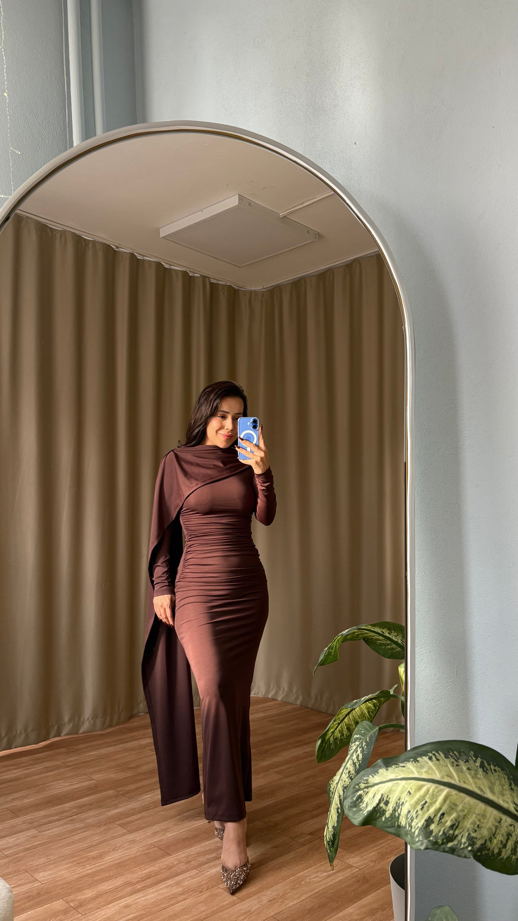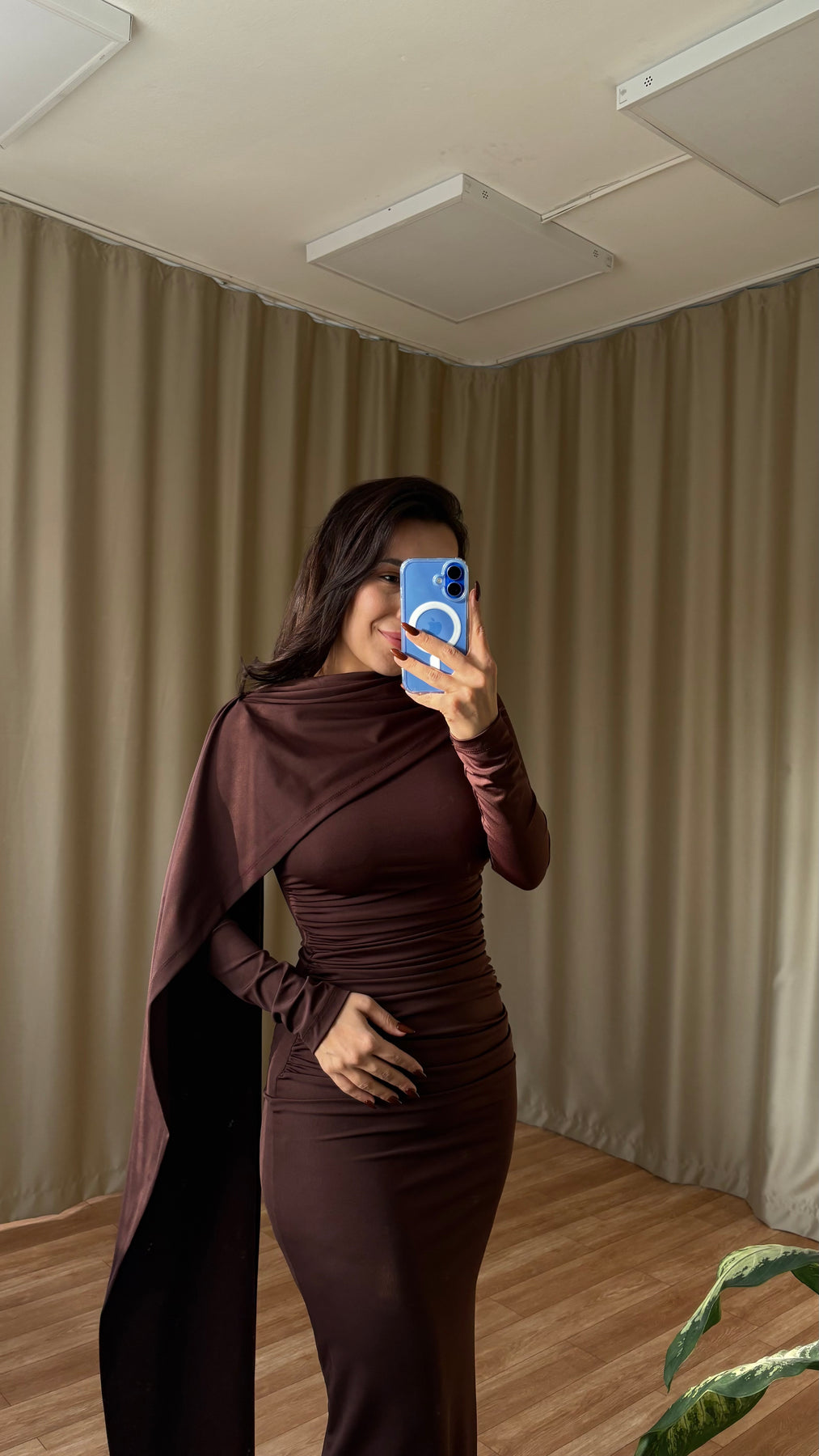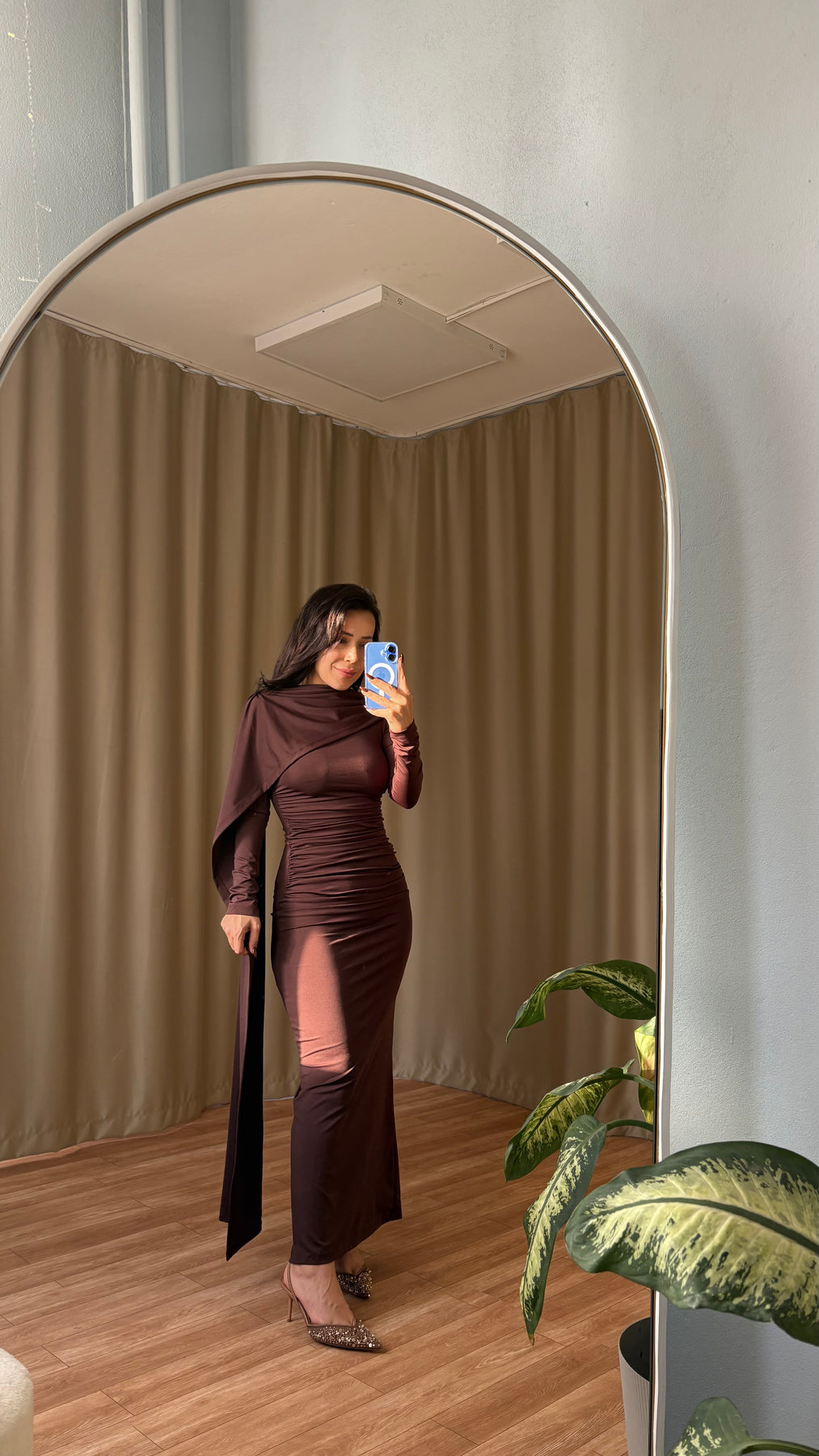 Şal detaylı elbise ( kahve )