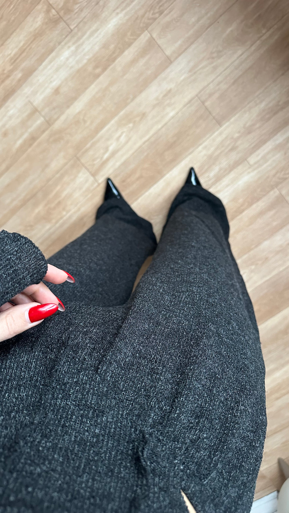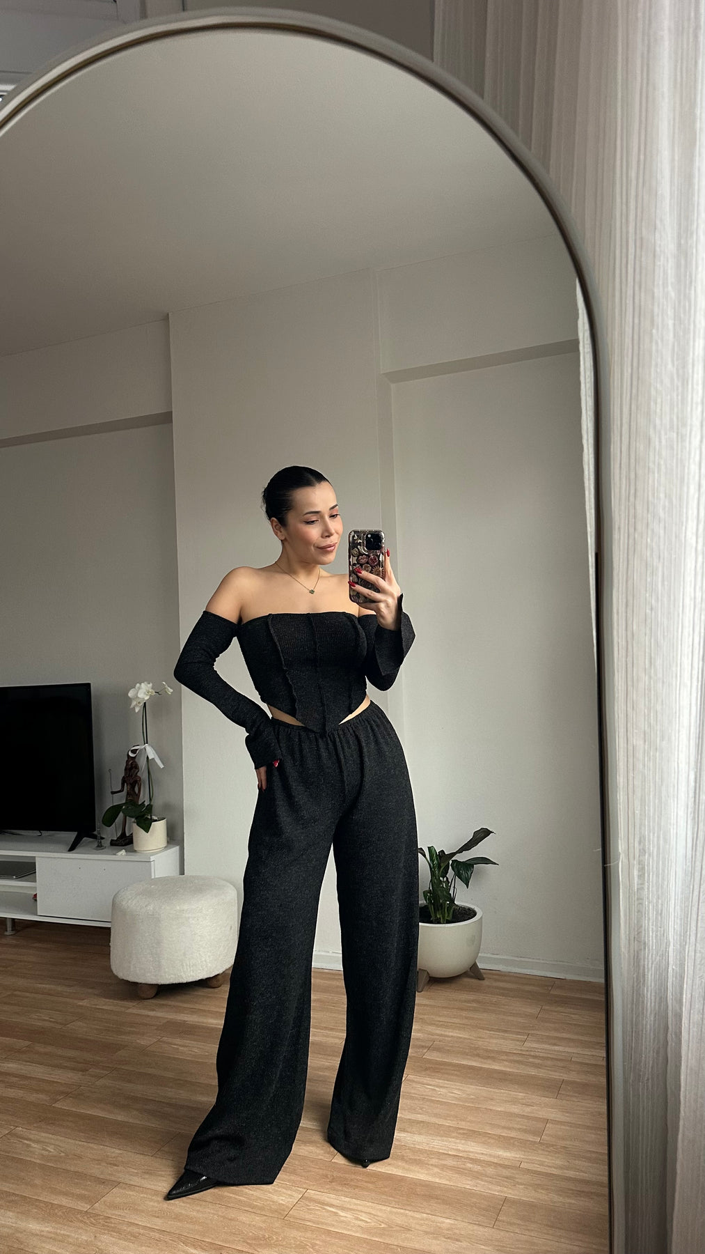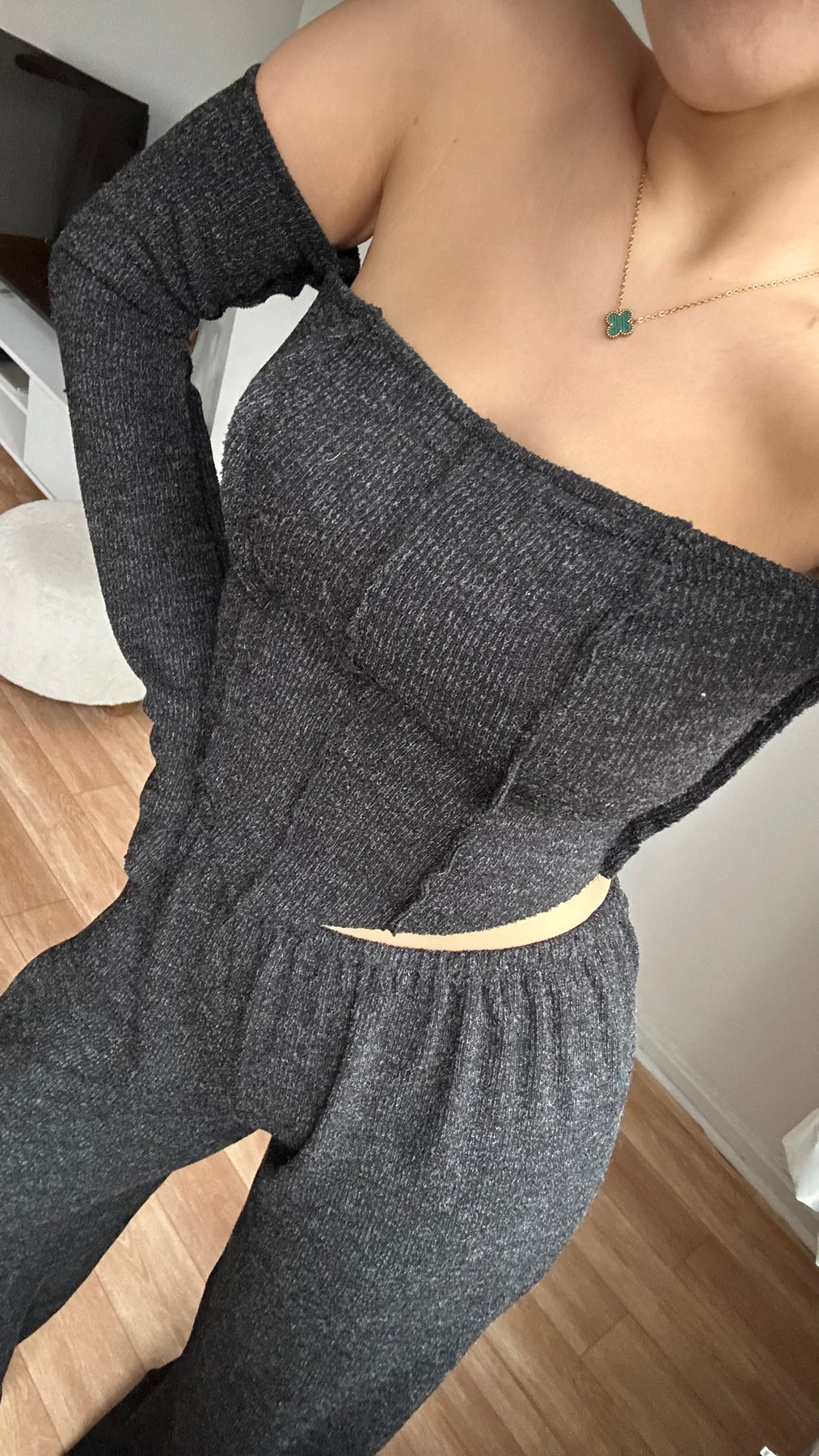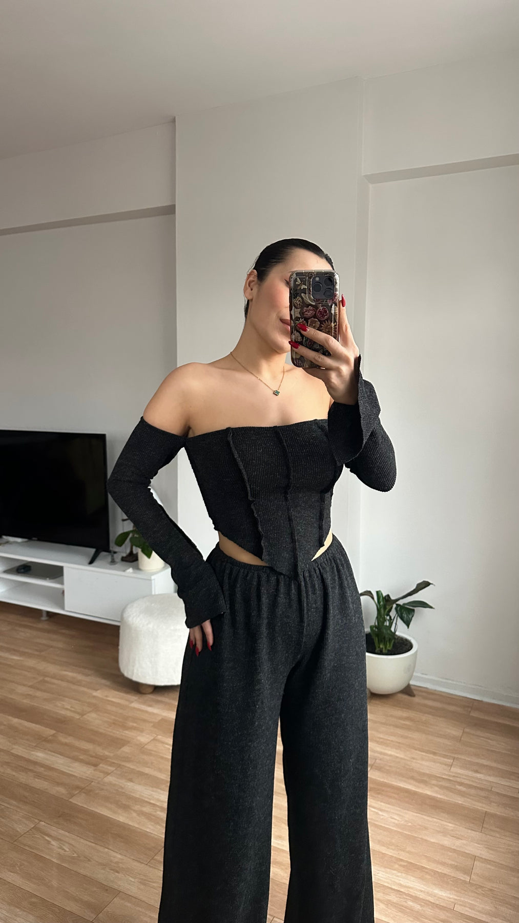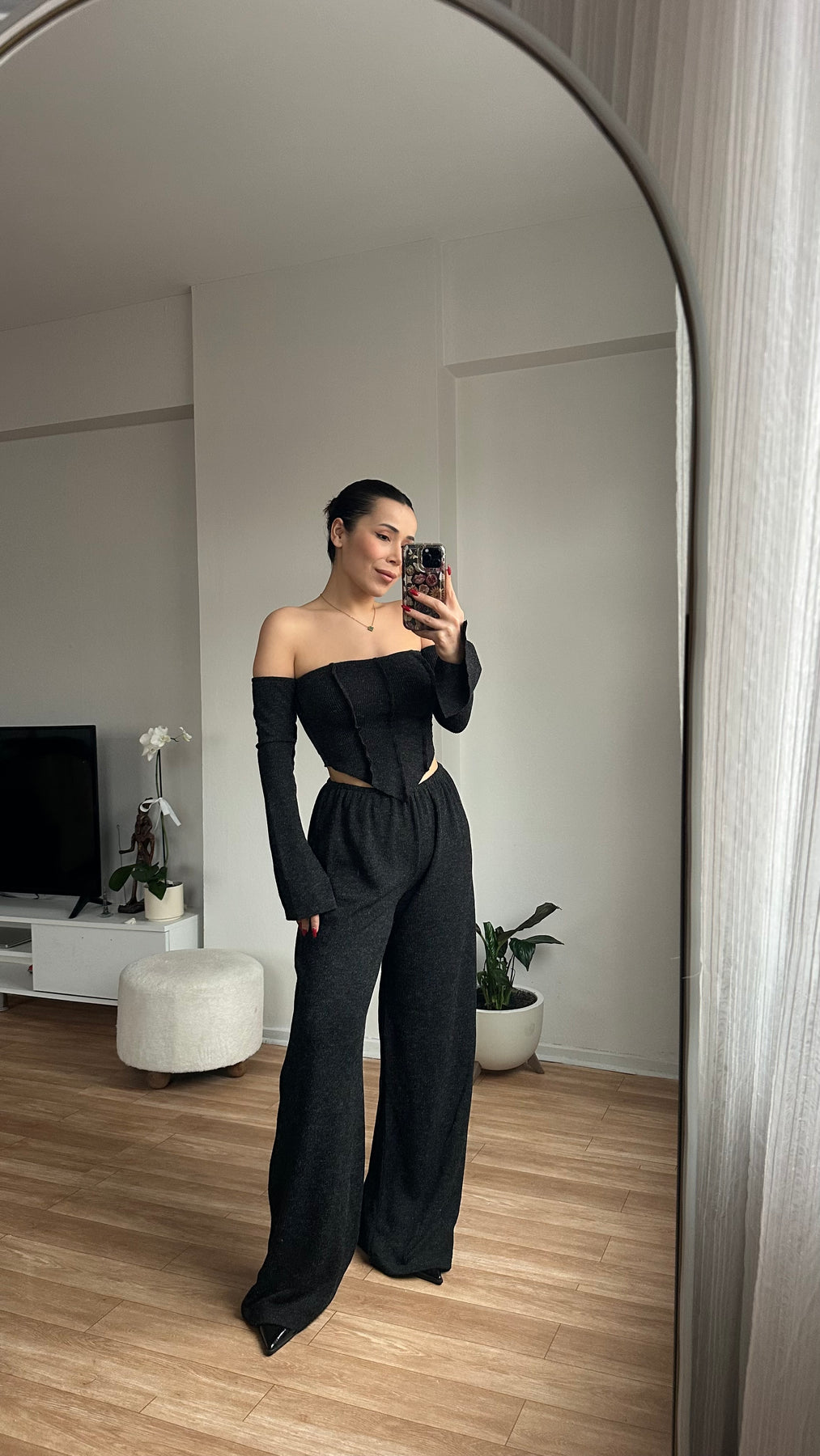 Düşük Omuz Bluz Pantolon Triko Takım Antrasit