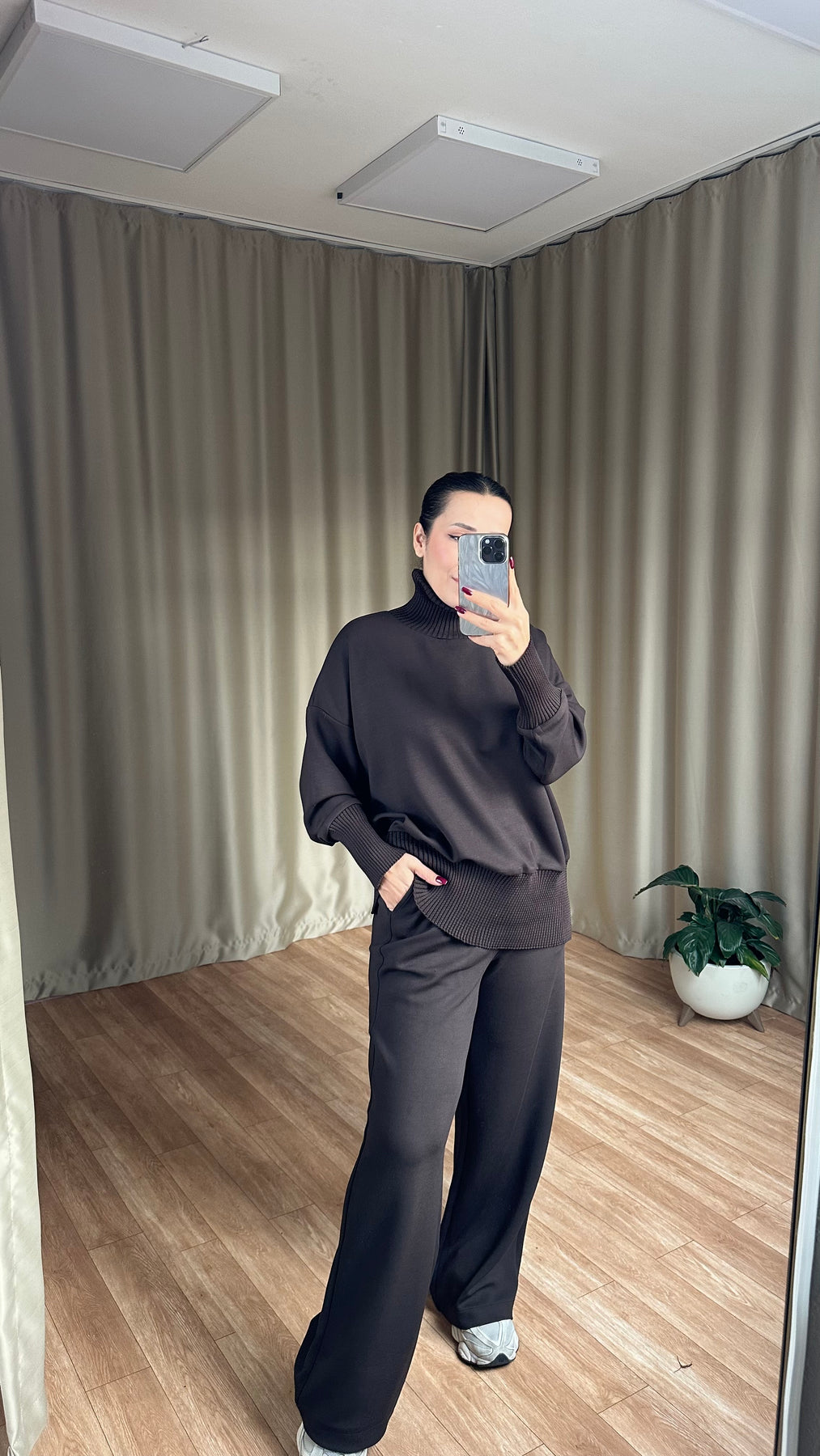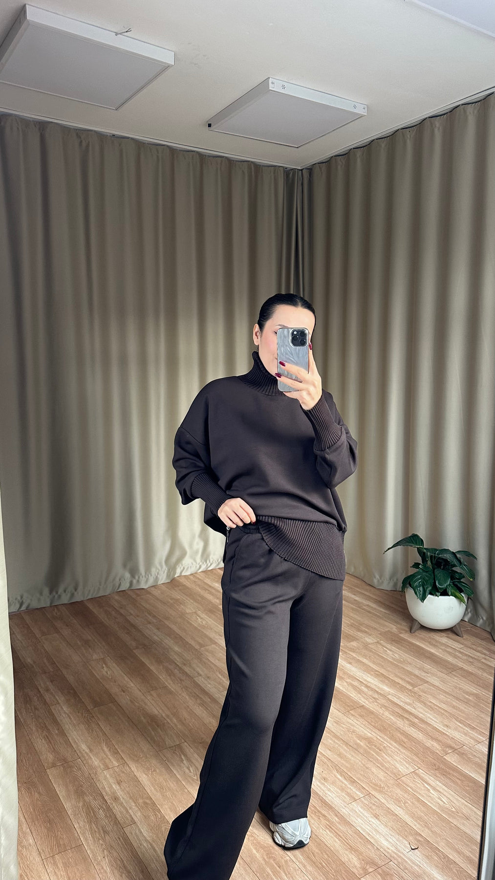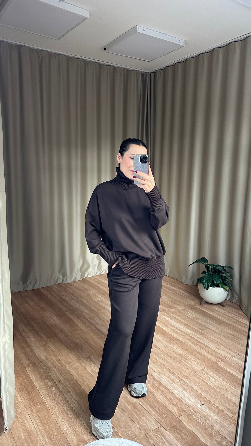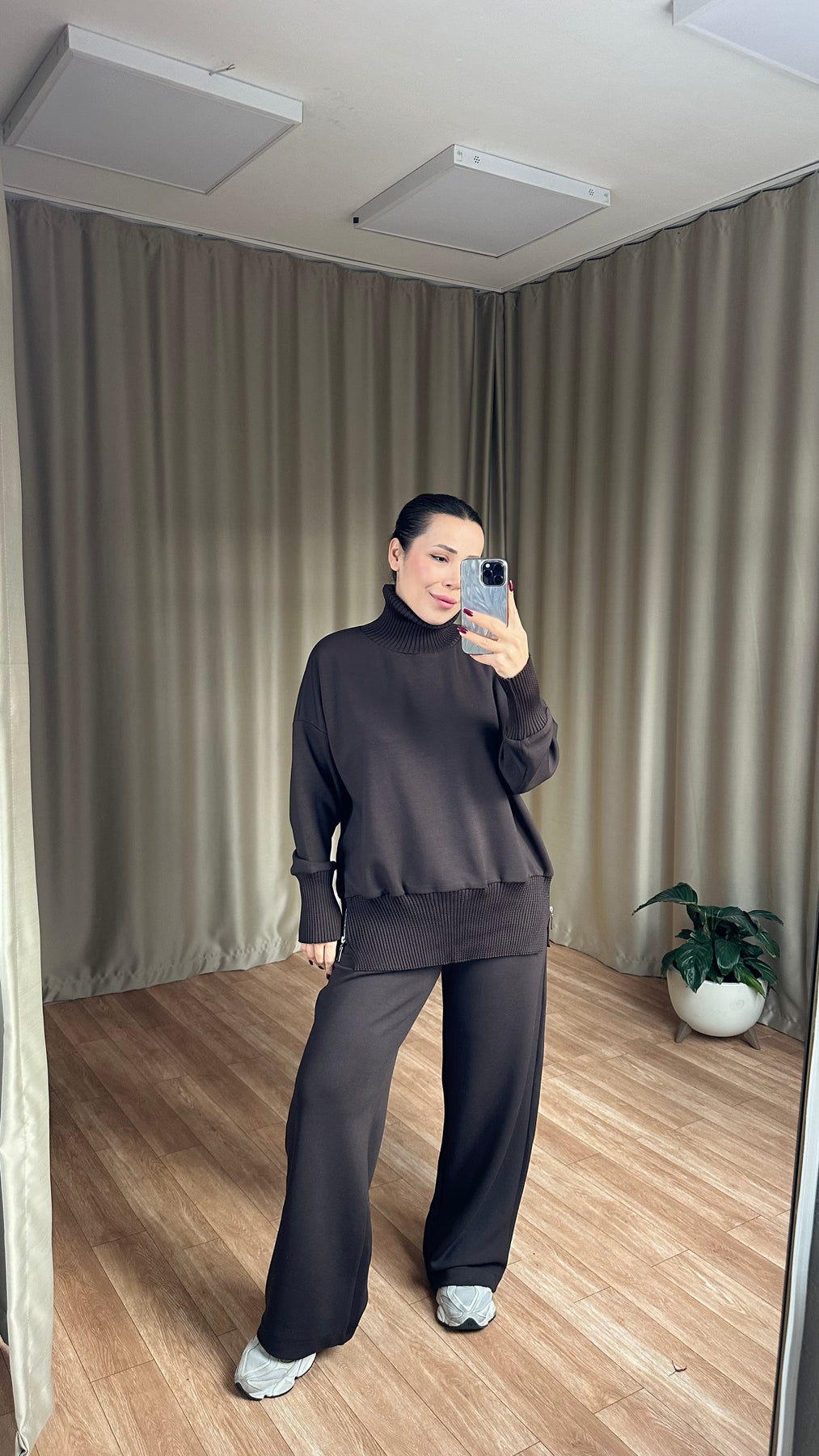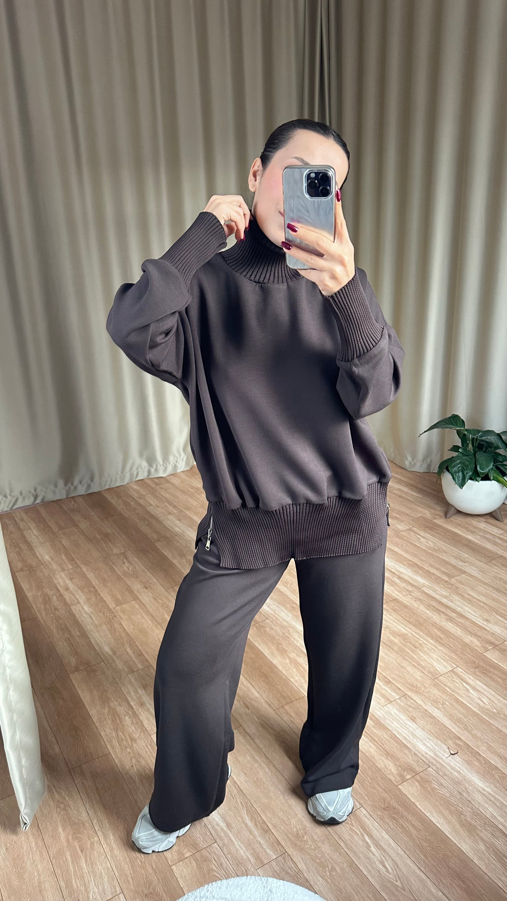 Kahve Balıkçı Yaka Yan Fermuarlı Modal Takım