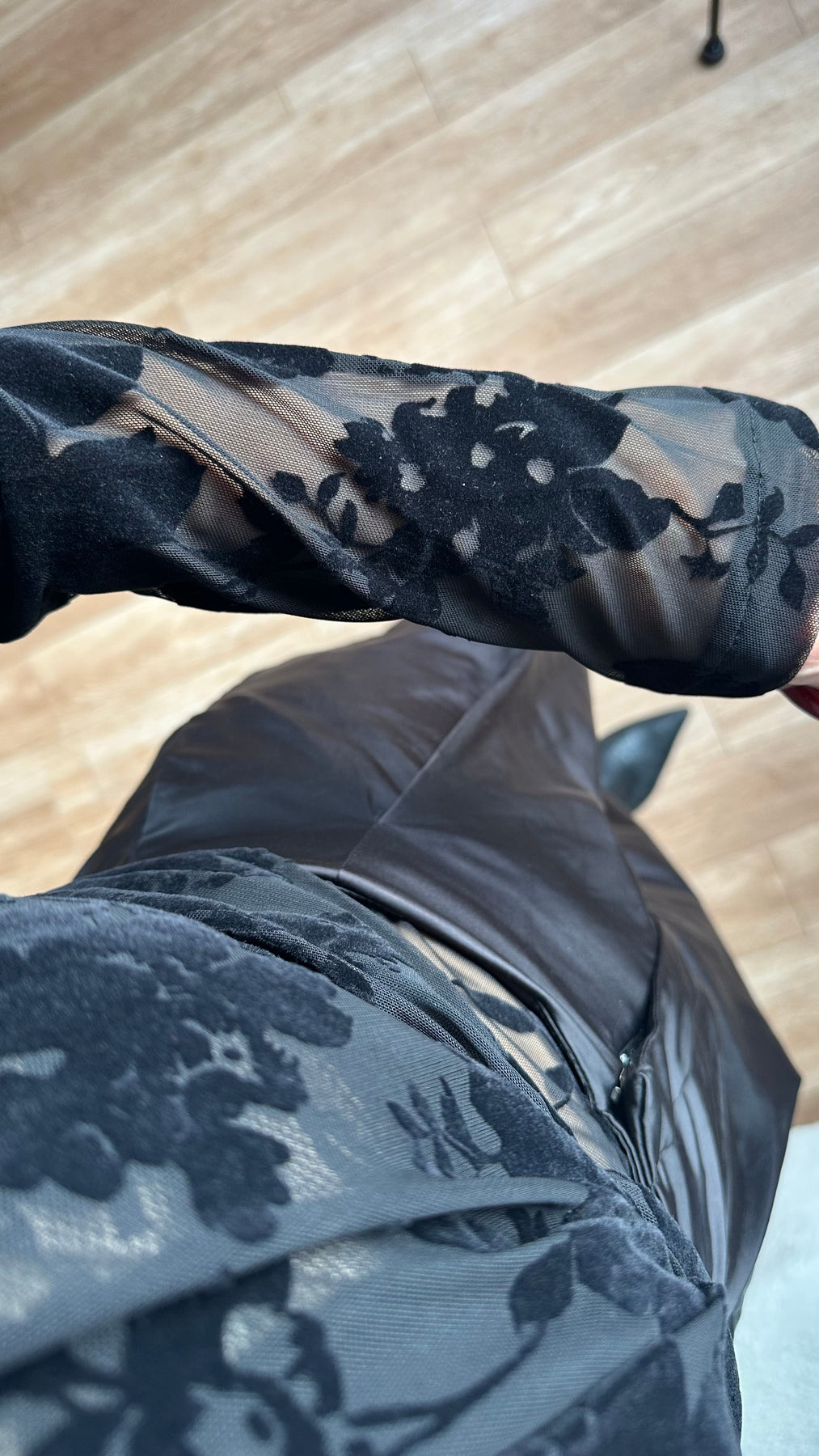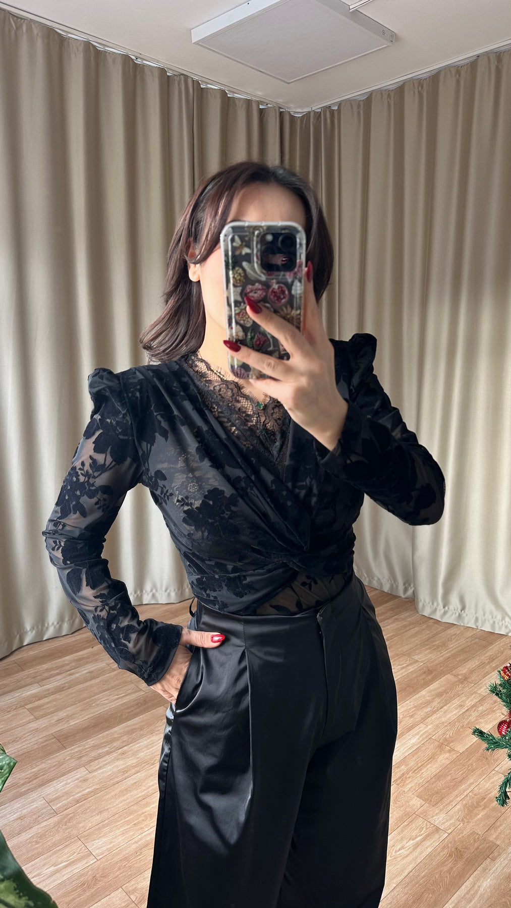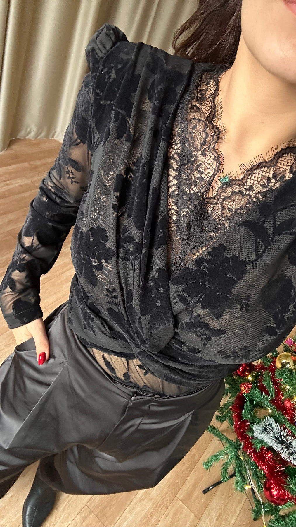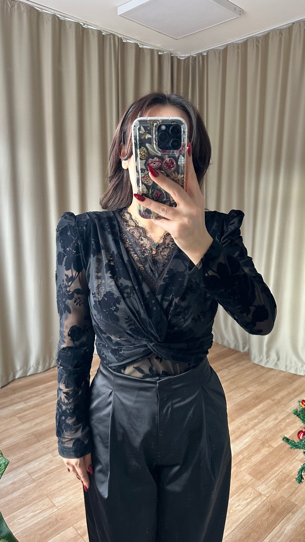 DANTEL DETAYLI KADİFE BASKILI BLUZ
