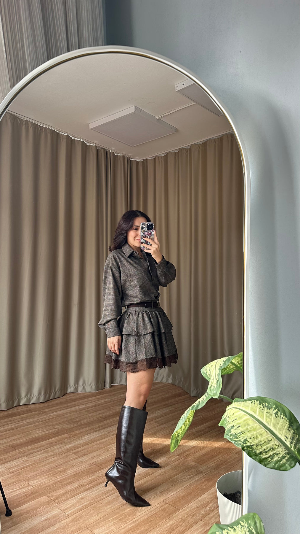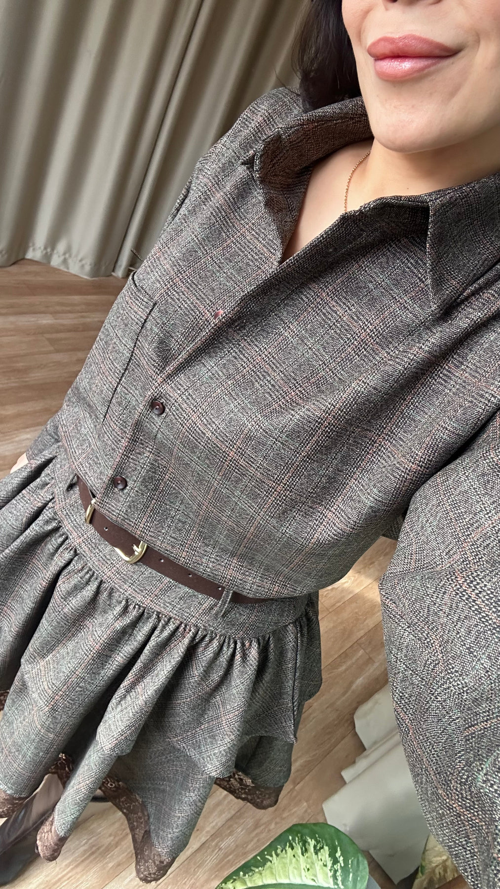 Kahve Dantel detaylı kendinden kemerli ekose takım